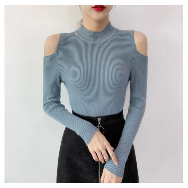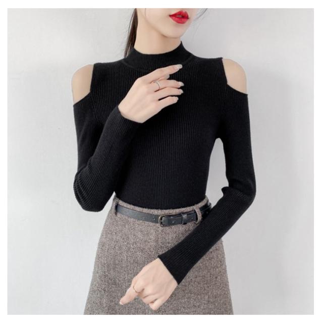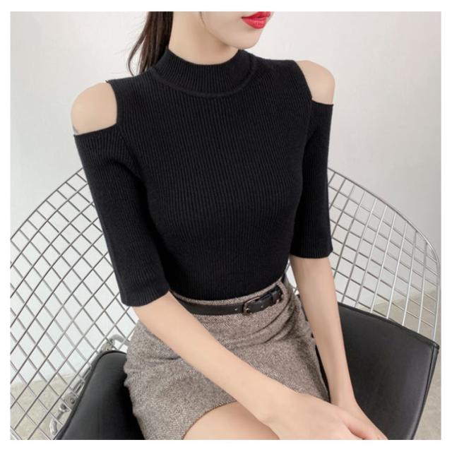 5分袖&長袖選べる!ニット リブニット 肩だし ニットトップス レディース 5分袖ニット 長袖ニット 肩だしニット リブ トップス ニットソー ハイネック コンパクト 秋 冬