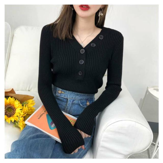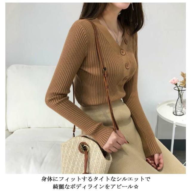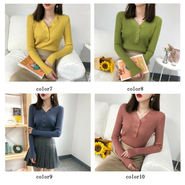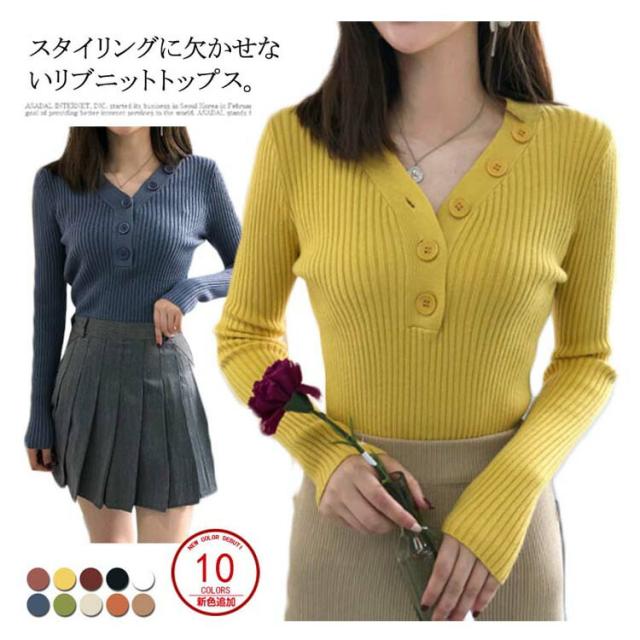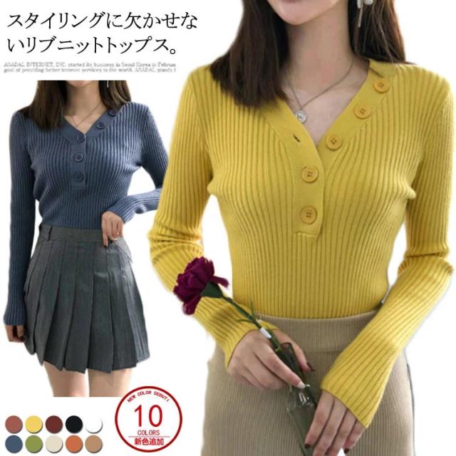 新色追加全10color!Vネック リブニット ニットトップス レディース ニット セーター プルオーバー リブ編み Vネックニット ボタン スリム 長袖 春 秋 冬 シンプル 無地 可愛い