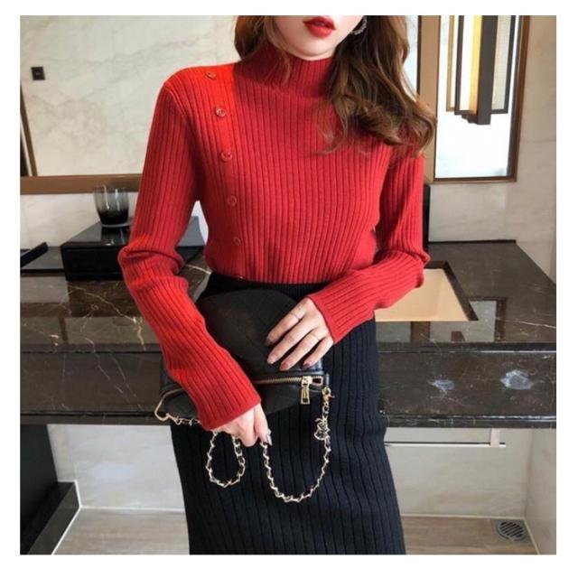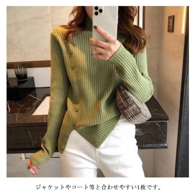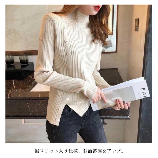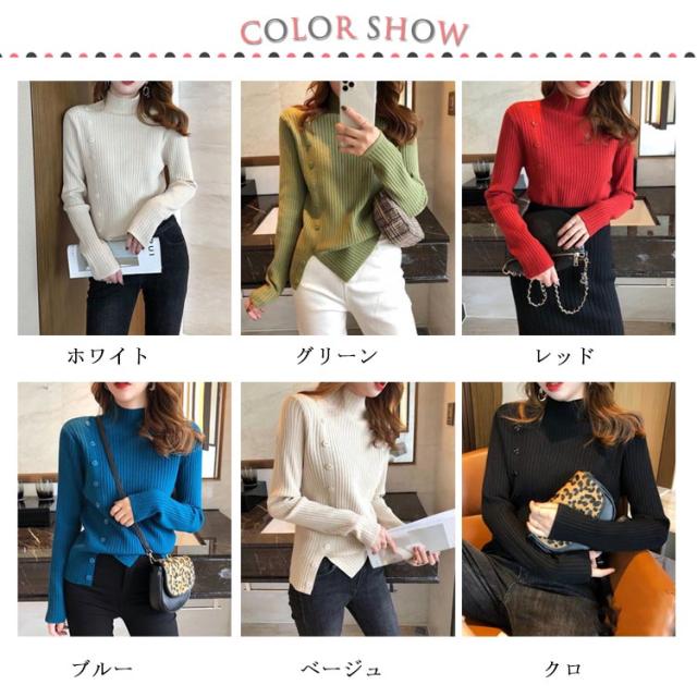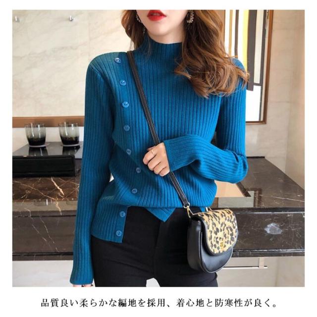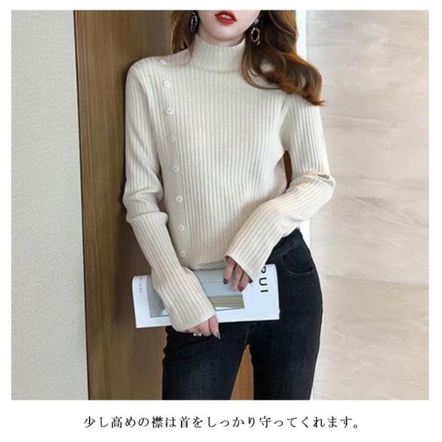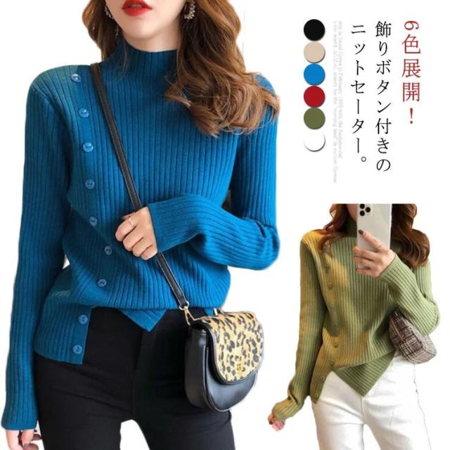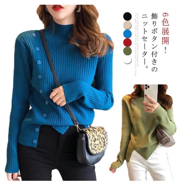 5色展開!ニットセーター レディース トップス ニット リブ ハイネック セーター クルーネック きれいめ おしゃれ 飾りボタン 長袖 厚手 通勤 秋 冬