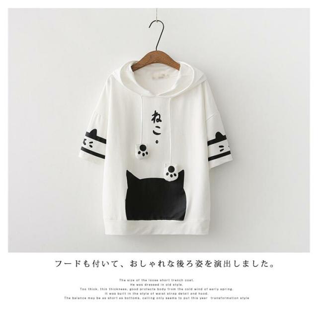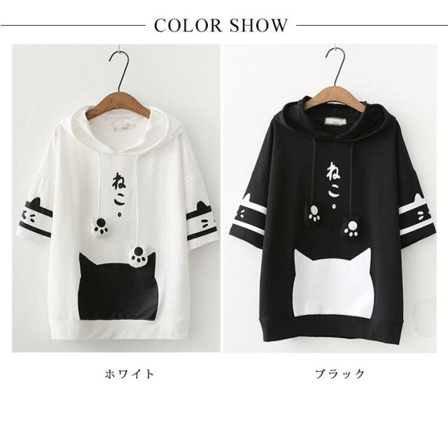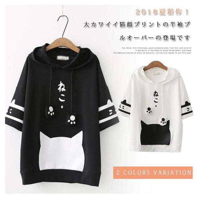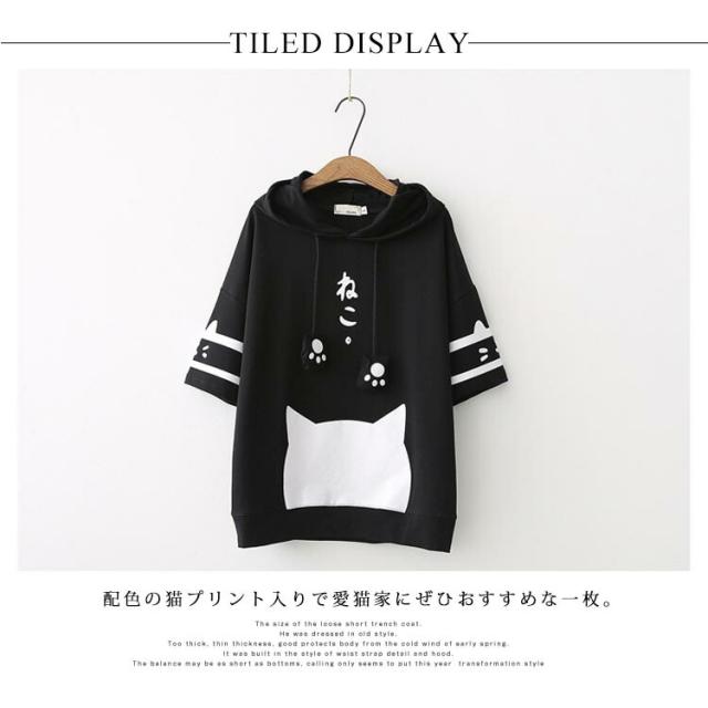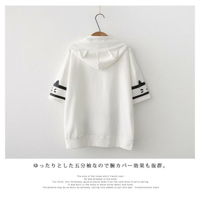 パーカー レディース 半袖パーカー トレーナー フード付き tシャツ 半袖 猫柄 カジュアル トップス 綿 春夏 可愛い