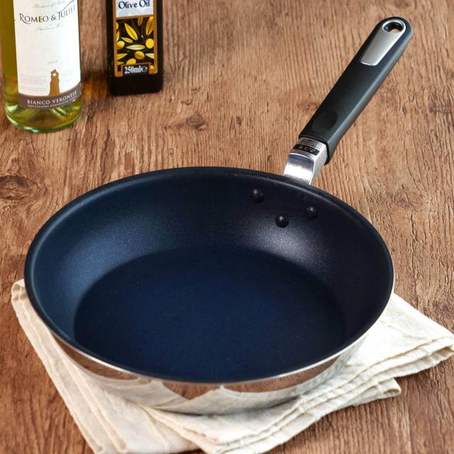 フライパンの内面はケマーズ社のテフロンプロファイル加工がしてあり、汚れも落としやすく、耐久性に優れています。ダイヤモンドとほぼ同等の硬さのシリコンカーバイトを中間コートに配合しているので、表面に傷が付きにくく金属ヘラの使用も可能です。