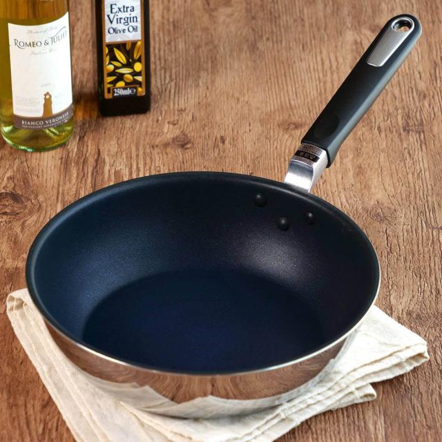 フライパンの内面はケマーズ社のテフロンプロファイル加工がしてあり、汚れも落としやすく、耐久性に優れています。ダイヤモンドとほぼ同等の硬さのシリコンカーバイトを中間コートに配合しているので、表面に傷が付きにくく金属ヘラの使用も可能です。