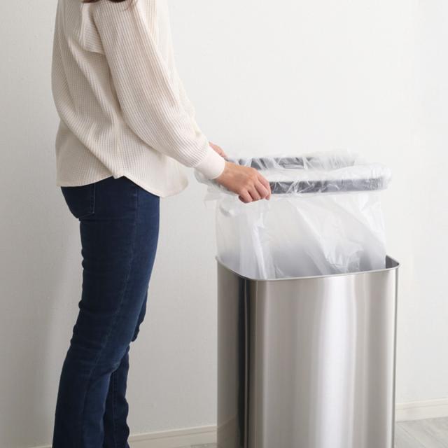 簡単にゴミ袋を交換できるストッパー付きです。袋をセットしてふたをすれば、外からゴミ袋が見えないので、生活感を感じさせずインテリアを損ないません。