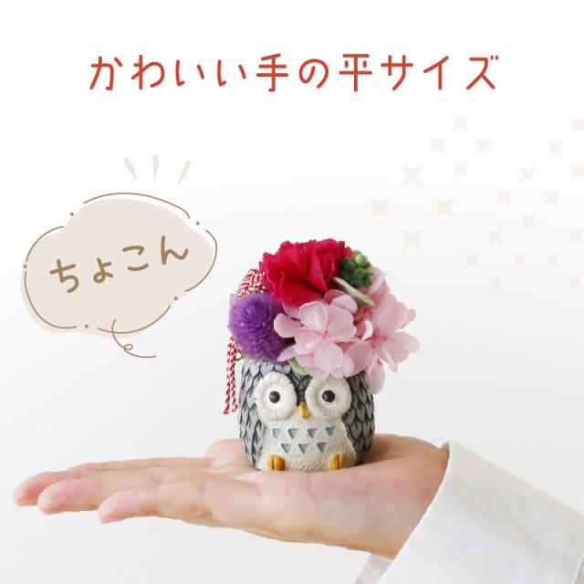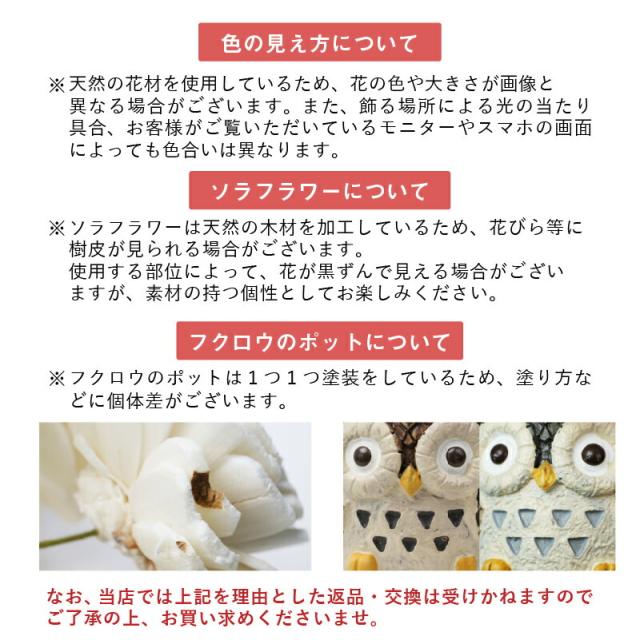 | 備考 | ・仕入れ時期により、花材の変更・花の色味が異なる場合がございます。 ・プリザーブドフラワーは自然のものなので、お花の大きさに個体差があります。 ・フクロウの花器は、手作りのため塗り方が一つ一つ異なります。 ・(フクロウの)色によって、花の配置が異なります。 ・改良のため、予告なく仕様変更する場合があります |