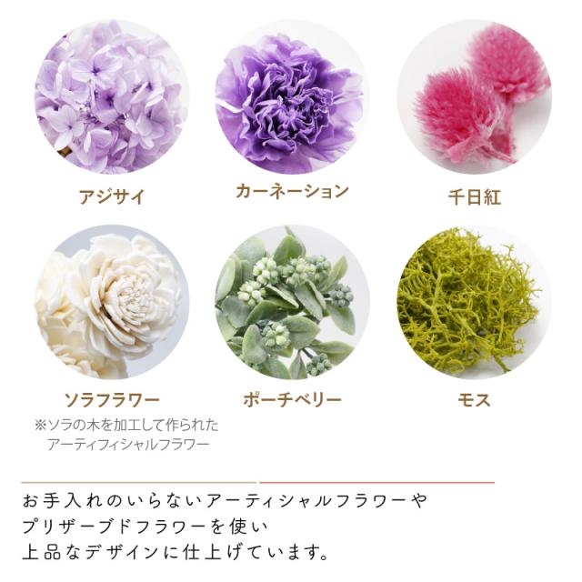 | 素材 | ふくろう:陶器 プリザーブドフラワー:カーネーション・あじさい アーティシャルフラワー:ポーチベリー ソーラーフラワー:ローズ モス:アイランドモス |