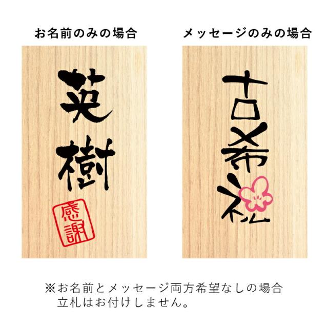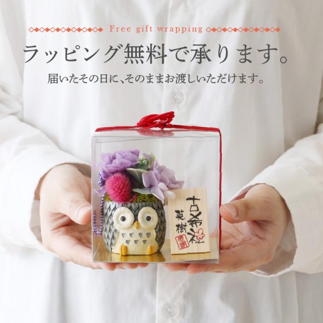 | \ しあわせ運ぶフラワーギフト♪ / ぽってり可愛らしいふくろうが お花と共に“福”をお届けいたします。 1. 縁起のいい ふくろう グッズ 見ているだけで癒される、ぽってり可愛いふくろうの器♪ ちょこんと手にのるサイズだから、 玄関 や リビング、寝室 などにもお気軽に飾っていただけます。 梟は昔から「幸運の鳥」と呼ばれ、 日本でも縁起物として大切にされてきました。 ふくろうが 縁起がいい と言われる理由、 それは様々な当て字があり、どれも「幸福」を意味するおめでたい言葉になるからです♪ ・福籠 … 福をたくさん詰め込む ・福老 … 幸せに年を重ねる ・不苦労 … 苦労がない ・福路 … 旅の幸福、人生の幸せ ・福来朗 … 福が来る など たくさんの福がおとずれるよう願いを込めて、 大切な人へ贈ってみてはいかがでしょうか。 2. 当店オリジナル! 和モダン アレンジメント 長年花ギフトを手掛けてきた当店のスタッフが、 お花の大きさやバランスを見ながら、ひとつひとつ丁寧にお作りします。 カーネーション あじさい 千日紅 を使用し、 艶やかで上品なデザインに仕上げました。和室・洋室どちらにも合わせやすく、飾るお部屋を選びません。 落ち着いた雰囲気の フラワーギフト をお探しの方におすすめです。 千日紅の花言葉は、「変わらぬ愛情」「不老長寿」。 長寿のお祝いに用いられることが多いお花なので、 目上の方へのプレゼントにもお喜びいただけます。 生花に特殊な加工を施したプリザーブドフラワーは、 枯れることがなく、水やりの必要もないことが大きな特徴。 瑞々しい質感と柔らかさを長い間保つことができる、 生花 と ドライフラワー の両方の良さを兼ね備えた 花材 です。 忙しくて日々の手入れができない お父さん お母さん や 体を動かすのが大変な おじいちゃん おばあちゃん にも 花のある暮らしを簡単に楽しんでいただけます。 お花のカラーは、ふくろうの色に合わせてお選びいただけます。 贈る相手を想い、お選びください。 3. お名前・メッセージ立札 贈る相手のお名前と、メッセージをプリントした木の立札をお付けします。 〔 メッセージ15種類 〕 特別なギフトシーンにぴったりなメッセージが15種類。 相手の事を想いながらお選びください♪ ・ 還暦祝 ・ 古希祝 ・ 喜寿祝 ・ 傘寿祝 ・ 米寿祝 ・ 卒寿祝 ・ 白寿祝 ・ 百寿祝 ・ 金婚式祝 ・ 銀婚式祝 ・ 誕生祝 ・ 感謝してます ・ いつもありがとう ・ ずーっと元気でいてね 〔 名入れプリント 〕 名入れギフト専門店の当店にて、気持ちを込めてお名前をプリントいたします。 「 どうして名前入りが喜ばれるの? 」 生まれた時からずっと一緒に生きてきた「名前」。 普段あまりにも身近にあるので、自分の名前のことを深く考える機会はありませんが 贈られた商品に自分の名前が刻まれていたらいかがでしょう。 その瞬間、“プレゼント”は“自分だけの大切なもの”へと変化します。 そして贈ってくれた方の真心を感じ、自然に笑顔がこぼれるのではないでしょうか。 名前はその人にとって唯一無二、かけがえのないものです。 私たちはそのお名前を大切に、贈る人、贈られる人、両方の笑顔を想いながら商品を送り出しています。 当店のお名前プリントは専門のスタッフがこだわりと自信をもって行っていますので、 1文字1文字つぶれることなく鮮明に印刷され、ずっと消えずに残ります。 お客様の気持ちのこもったギフトを永く愛着を持ってお使いいただけますように。 それが、私たち名入れギフトOkuluスタッフ全員の願いです。 ≪こんなシーンにおすすめ≫ ・ 60代 70代 80代 90代 のご年配の方への贈り物に ・ 友達 への 誕生日 プレゼント に ・ 父親 母親 への 父の日 母の日 ギフトとして ・ 祖父母 への 敬老の日 ギフト として・ 還暦 古希 喜寿 傘寿 米寿 卒寿 白寿 百寿 の 長寿祝い に ・ お見舞い 快気祝い 内祝い の贈り物として ・ 退職祝い 定年退職 送別会 の 記念品 に ・ 両親 や 親戚 の 結婚記念日 金婚式 銀婚式 の 記念品 に |