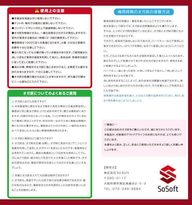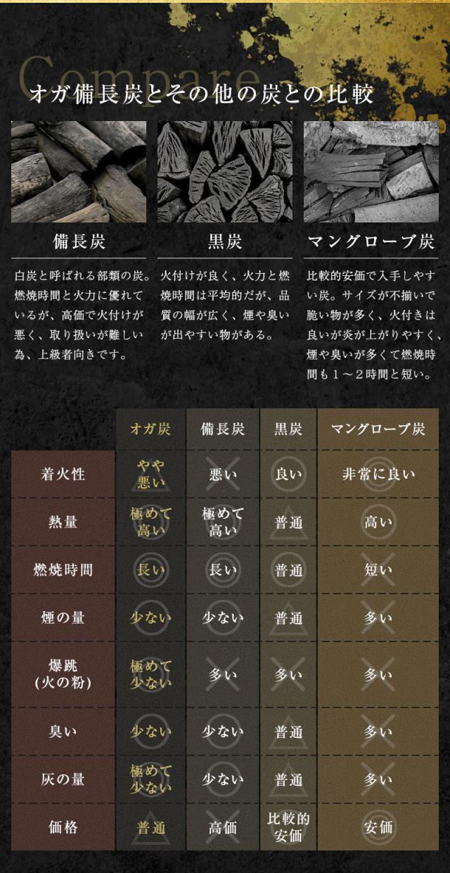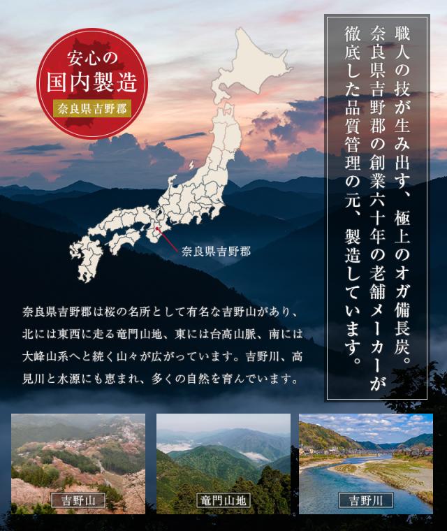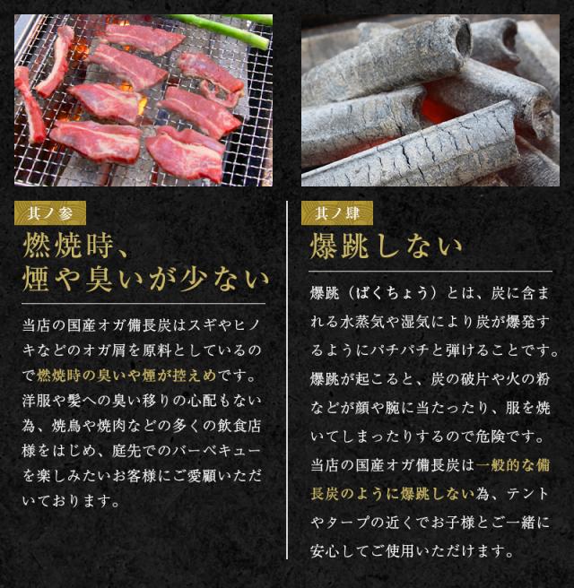 | 商品詳細 | ■産地 日本国産 ■着火性 やや 悪い ■熱量 極めて 高い ■燃焼時間 長い ■煙の量 少ない ■爆跳 (火の粉) 極めて 少ない ■臭い 少ない ■灰の量 少ない ■価格 普通 ■保存方法 直射日光、高温多湿を避けて保存してください。 |