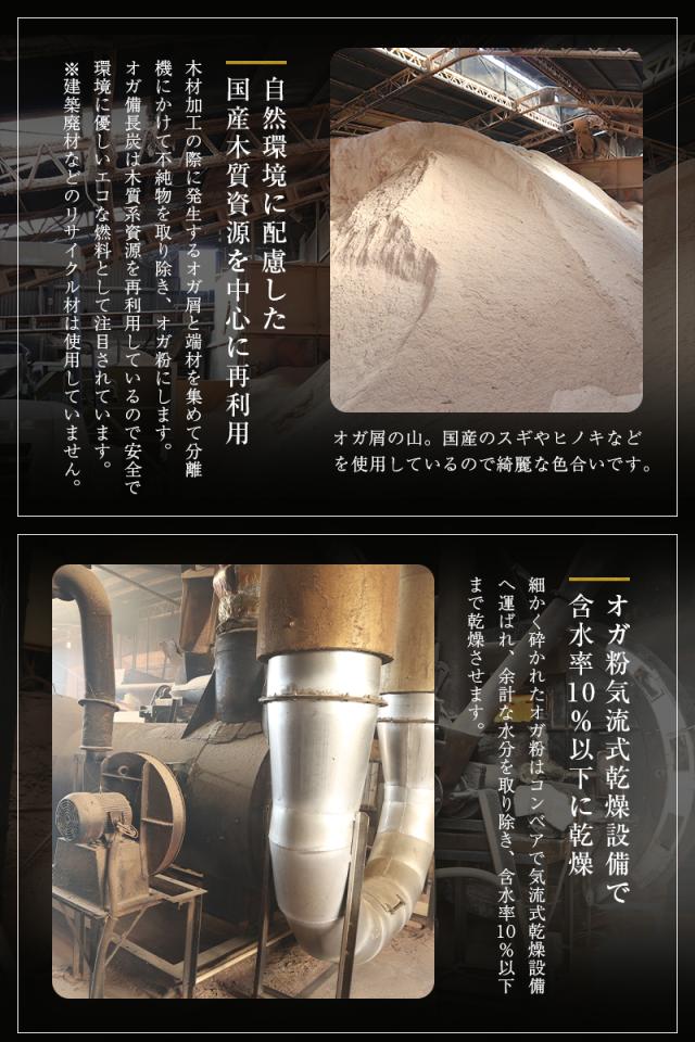 また、スギやヒノキな どのオガ屑を原料としているので燃 焼時の臭いや煙が控えめです。