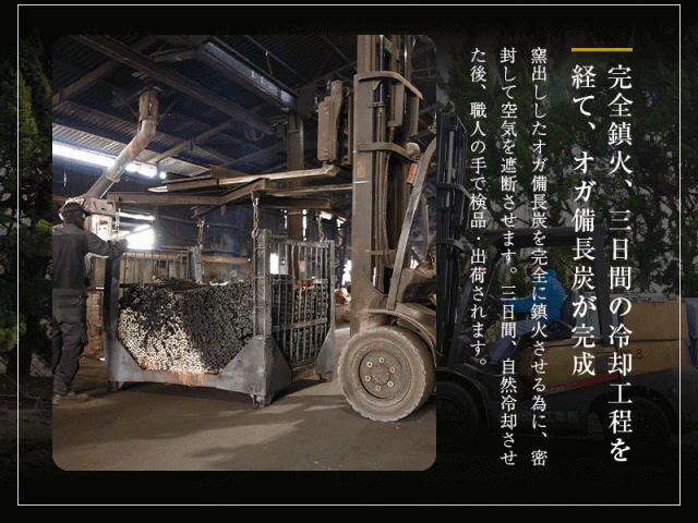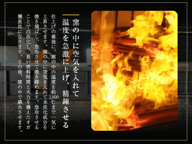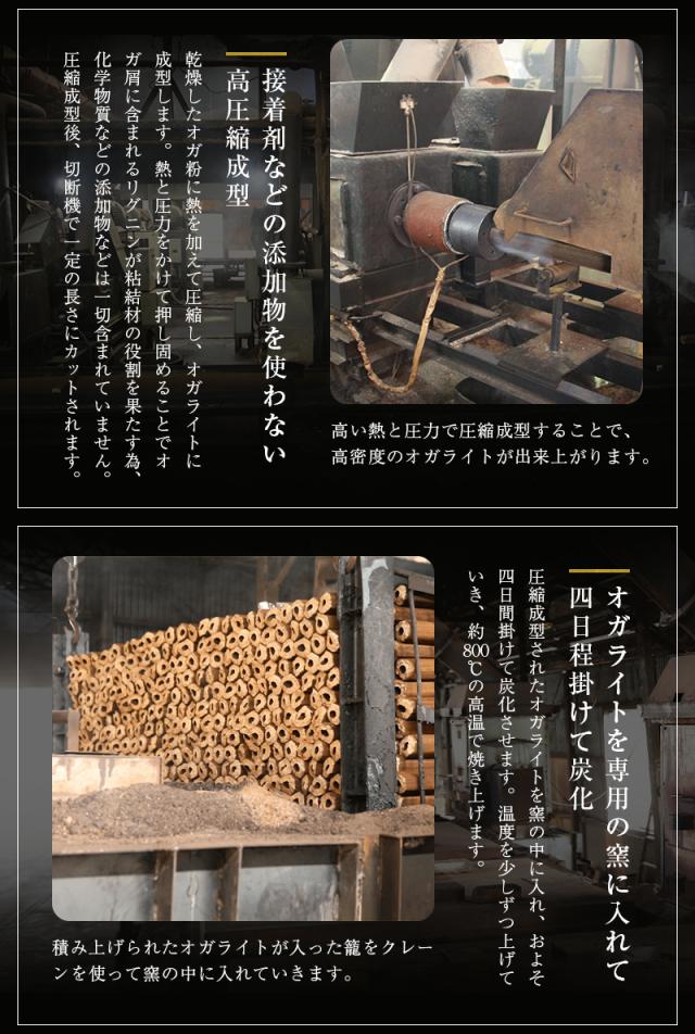 当店のオガ備長炭は一度火が点くと、遠赤外線効果で赤々とゆっくり加熱される為、安定的に熱を放射し、一般的な黒炭の2倍以上の燃焼時間で燃え続けます。