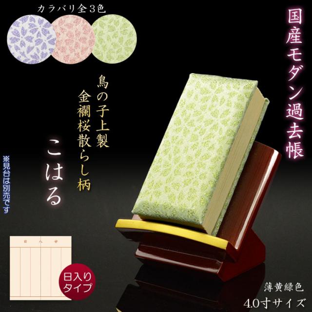 仏具【過去帳 鳥の子上製 金襴桜散らし柄 こはる:4.0寸・日入りタイプ 薄黄緑色 家名入り】仏壇・仏具 全宗派対応 過去帖 四十九日 命日 送料無料
