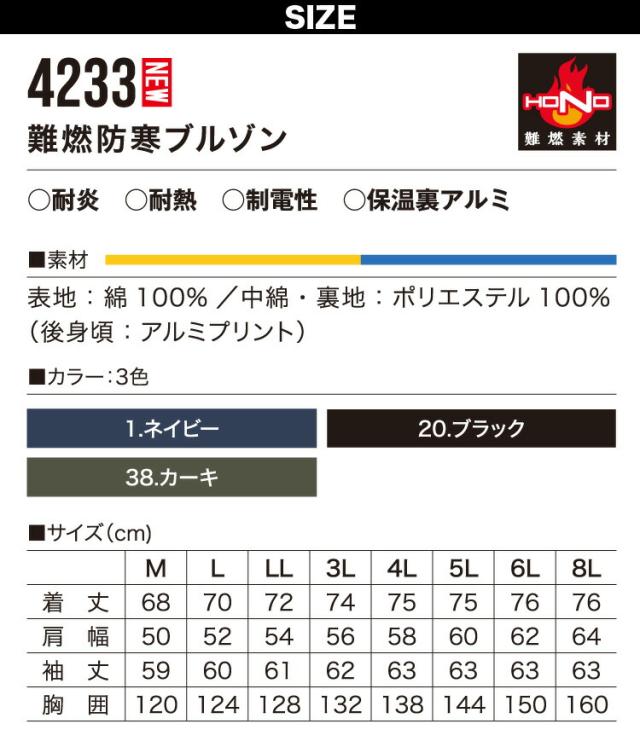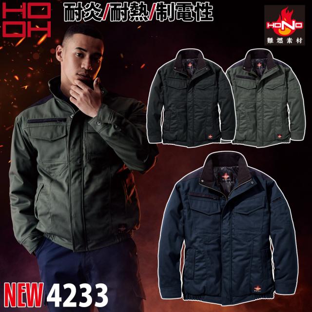 村上被服 難燃防寒ブルゾン 4233 M〜5L 作業服 作業着 綿100% 保温裏アルミ 防炎服 耐炎 耐熱 制電性 2022年 秋冬 新作 おしゃれ かっこいい メンズ HONO HOOH