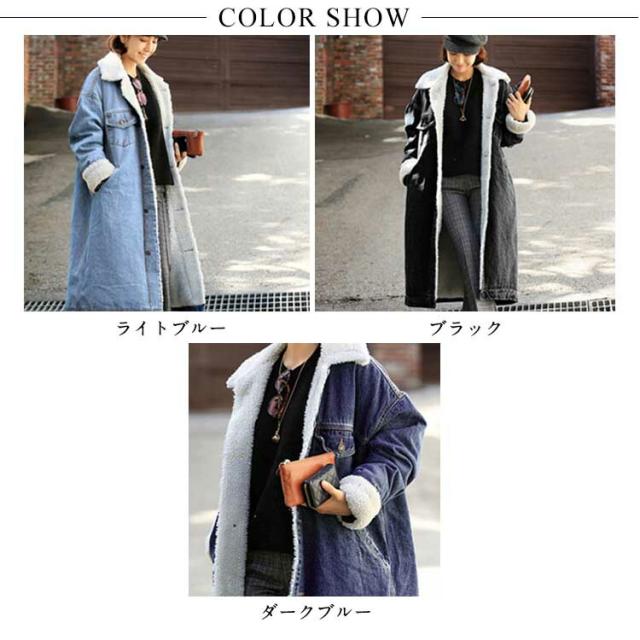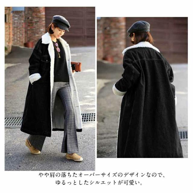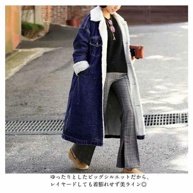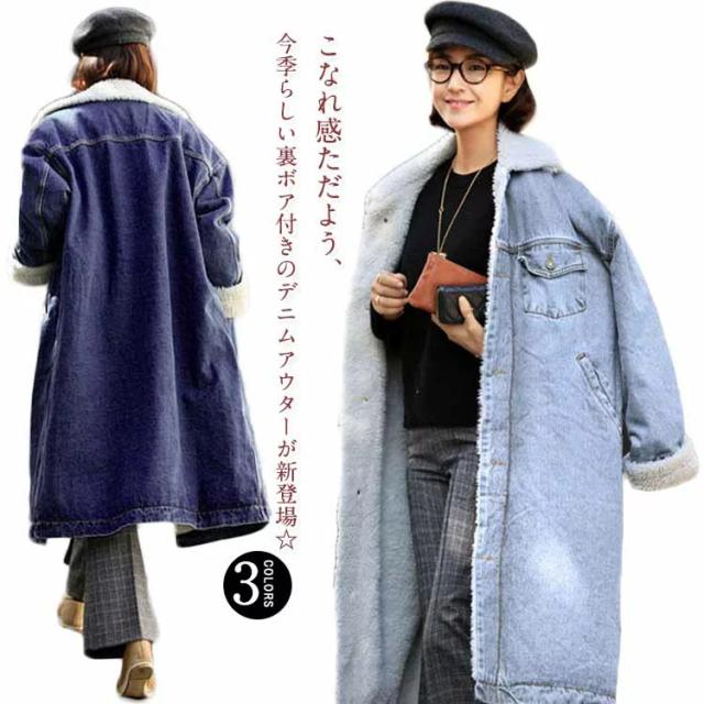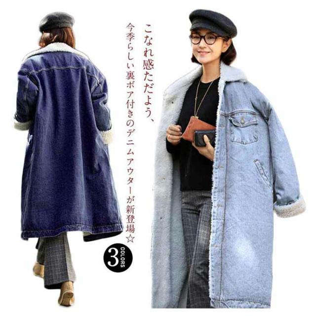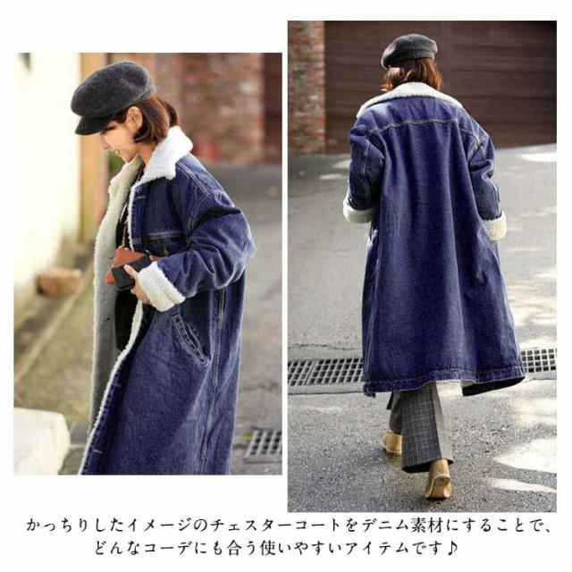 裏起毛 デニムコート デニム チェスターコート ロングコート オーバーサイズ ビッグシルエット 裏ボアコート ロング丈 ステンカラー 膝下丈 秋 冬 秋冬 カジュアル あったか 保温 防寒 レディース