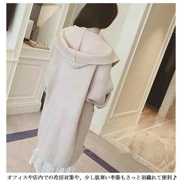 | 着心地とシルエットにこだわったアウターがお見え! 大きめフード付きデザインがおしゃれな後ろ姿を演出。 シンプルノーボタンタイプで羽織るだけでOK. 最高級の着心地をKEEPし、腕も細く見せてくれるワイドスリーブタイプです!! オフィスや店内での冷房対策や、少し肌寒い季節もさっと羽織れて便利♪ | |