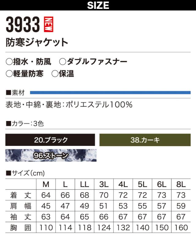 村上被服 防寒ジャケット 3933 6L 8L 大きいサイズ 軽量防寒 作業服 作業着 撥水 防風 保温 ダブルファスナー 防寒着 2022年 秋冬 新色 おしゃれ かっこいい メンズ HOOH