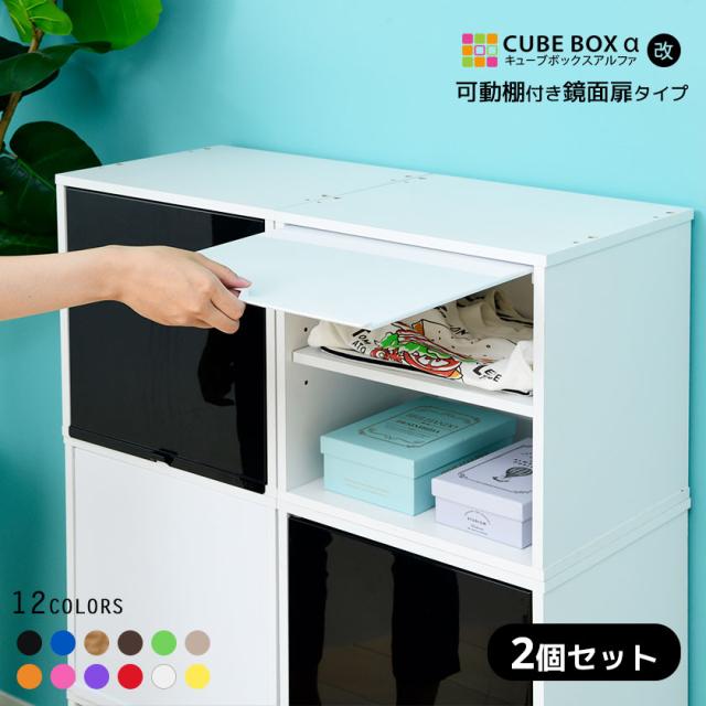 【2個セット】カラフル12色 鏡面 扉付き キューブボックスα (可動棚付きタイプ) 卓上 木製 収納棚 カラーボックス 正方形 幅30cm 収納 ボックス A4 ケース 積み重ね フラップ扉
