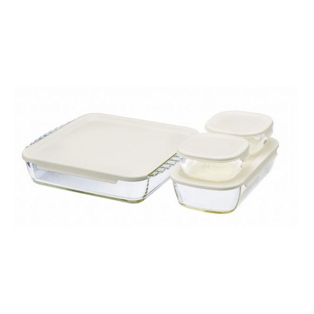 HARIO ハリオ スタッキング耐熱ガラスコンテナ・スクエア 4個セット HKOZ-5004-OW 満水容量KST-25/250ml KSTL-90/900ml HKOZ-200/2000ml オフホワイト 耐熱ガラス保存容器【送料無料】