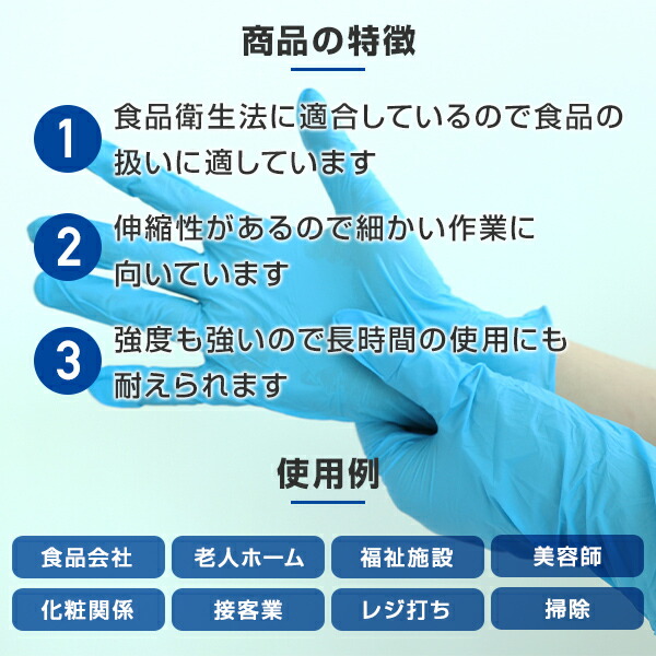 | 商品説明 | ●食品衛生法適合品 ●パウダーフリー ●伸縮性があるので細かい作業にも ●強度も強いので長時間使用も可能 ●左右兼用なので片手でも使えて経済的 |
