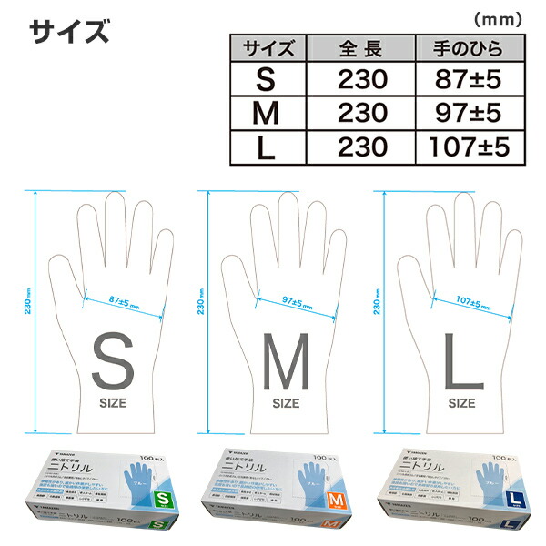 | 本体サイズ | S:全長230、手のひら87±5mm M:全長230、手のひら97±5mm L:全長230、手のひら107±5mm 厚み:0.08±0.03mm |