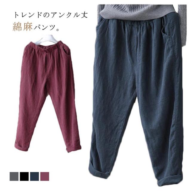 リネンパンツ 綿麻 パンツ サルエルパンツ 9分丈 アンクルパンツ ウェストゴム レディース イージーパンツ テーパードパンツ 夏服 2020 新作