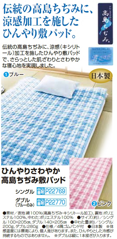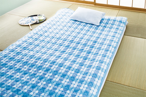 伝統の高島ちぢみに、涼感(キシリトール)加工を施したひんやり敷パッドで、さらっとした肌ざわりとさわやかな寝心地を実現しました。