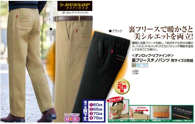 ダンロップ・リファインド 裏フリースチノパンツ(同サイズ2色組) 選べる股下丈 長ズボン チノパン メンズ 紳士服 シニア 男性 ブラック ベージュ 黒 フリースパンツ シンプル ロゴ あったかい 暖かい シニアファッション 50代 60代 70代 80代 父の日 お父さん 敬老の日
