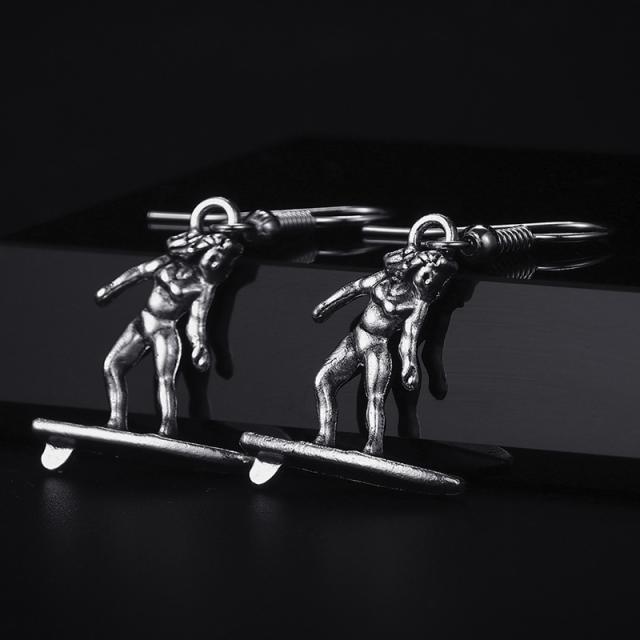 ビキニの水着でサーフボードにのった女性をモチーフにした銀色シルバーのチャームが揺れるフックタイプのステンレスピアス。