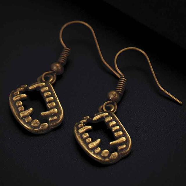 吸血鬼ドラキュラ伯爵の牙やバケモノやモンスターのキバをモチーフにした金色ゴールドのチャームが揺れるフックタイプのステンレスピアス。