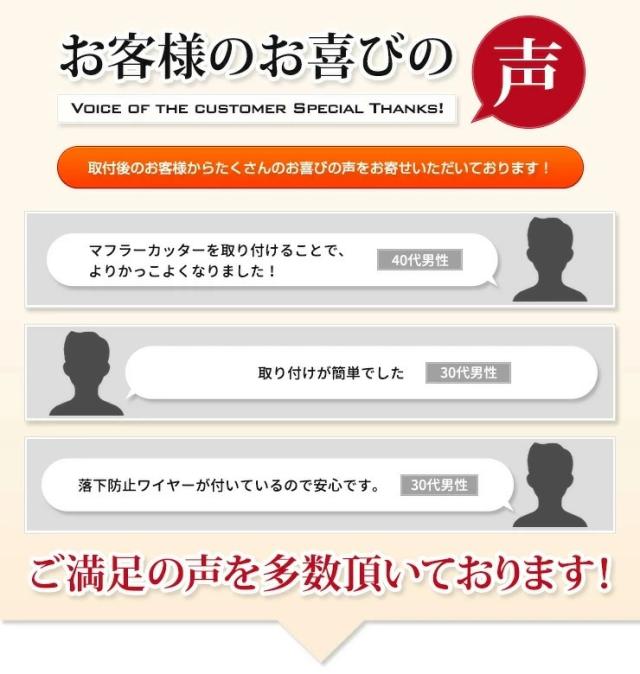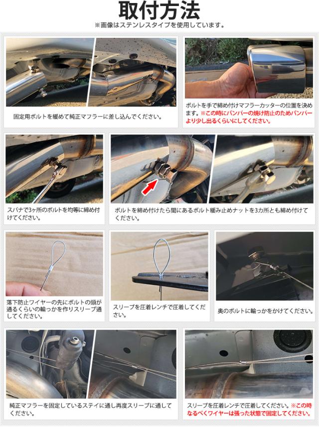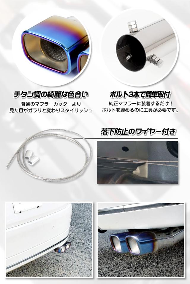 チタン調の綺麗な色合いの、2本出しマフラーカッターが登場。 エクステリアに高級感をプラスして、ワンランク上のドレスアップを手に入れられます! ボリュームのある2本出しタイプ! 取付はボルト3カ所で取付し、さらに落下防止ワイヤー付きなので万が一の時も安心です。 |