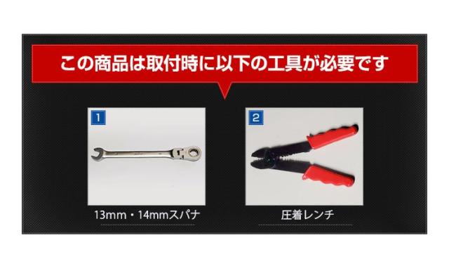 ■本品またはご使用の際のキズ・破損等に対する保証はございません。ご使用は自己責任にてお願い致します。 ■振動が多い場所になるのでねじが緩む可能性が高いので必ず落下防止ワイヤーは取り付けてください。 ■本品の取付には工具が必要となります。(13mm・14mmスパナ、圧着レンチ) |