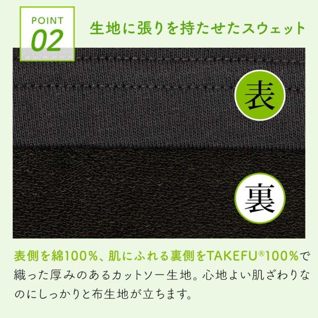 表側を綿100%で、肌にふれる裏側をTAKEFU(R)100%で織った厚みのあるカットソー生地。心地よい肌ざわりなのにしっかりと布生地が立ちます。