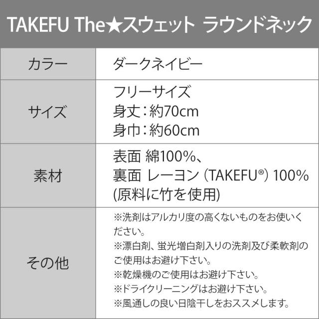TAKEFU The★スウェット ラウンドネック 男女兼用 ダークネイビー 薄手 オールシーズン 吸汗 吸湿 ニオワない アトピーにやさしい 肌側竹布100% 合わせやすいカラー