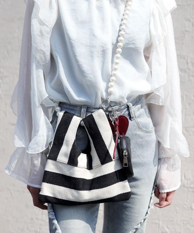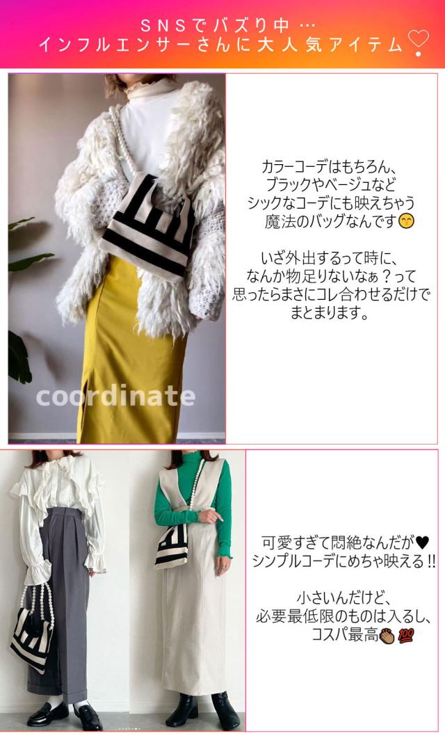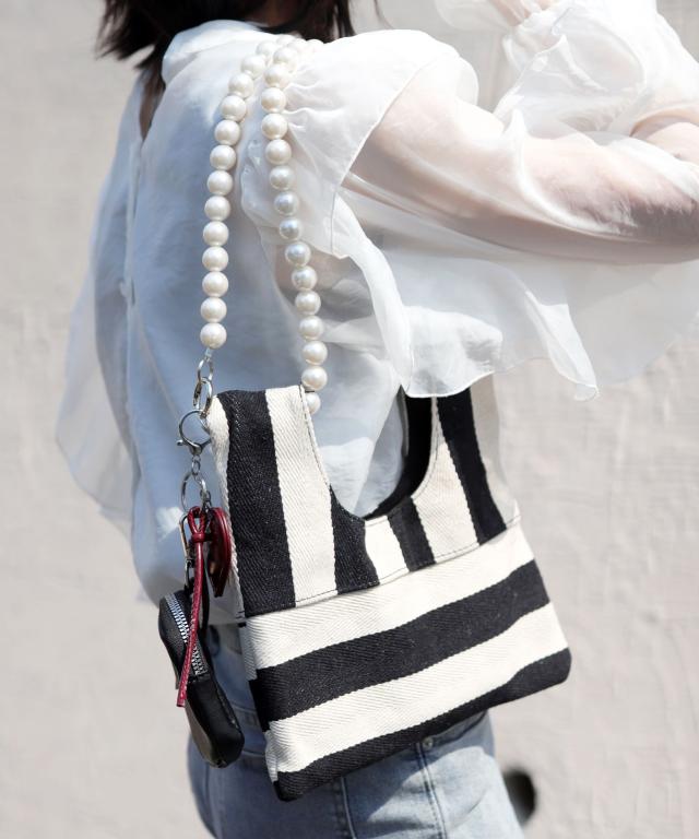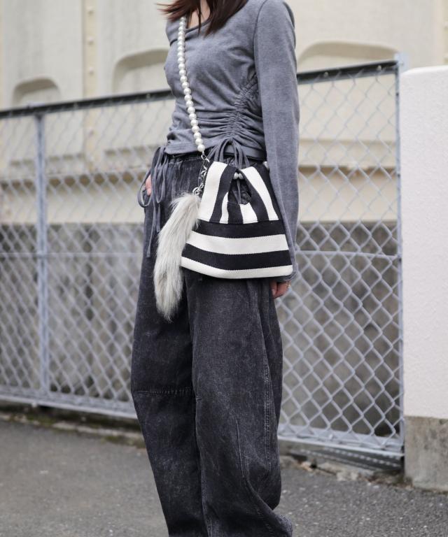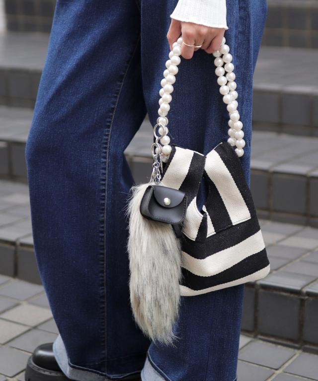 パールチェーンのストライプ柄ミニショルダーバッグ/小さめハンドバッグ。