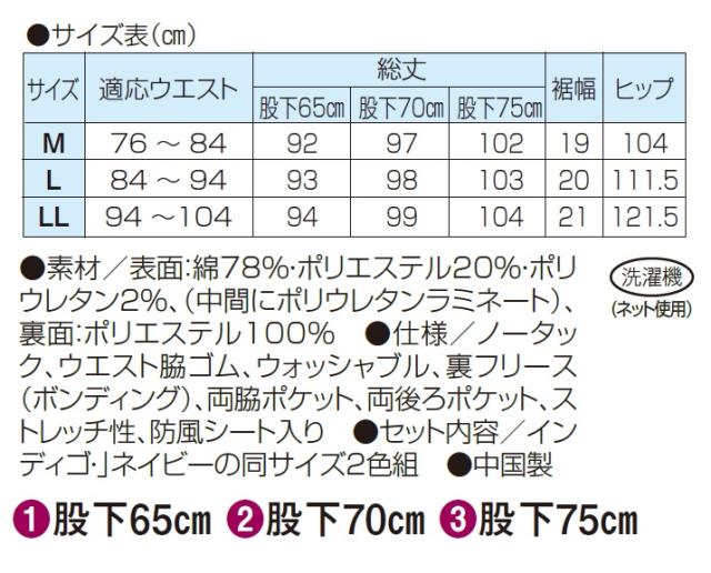 ●仕様/ノータック、ウエスト脇ゴム、ウォッシャブル、裏フリース(ボンディング)、両脇ポケット、両後ろポケット、ストレッチ性、防風シート入り