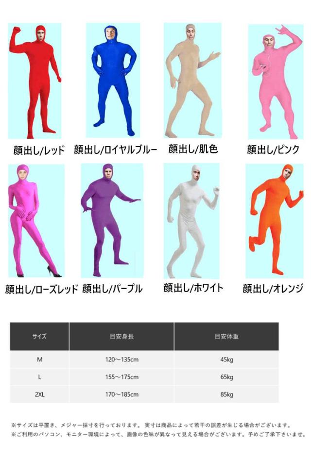 全身タイツ コスチューム 大人用 バックジッパー メンズ レディース 選べる2タイプ 伸縮性あり 顔出しタイプ 忘年会 クリスマス会 パーティー ハロウィン 仮装 変装 文化祭 余興 全12色