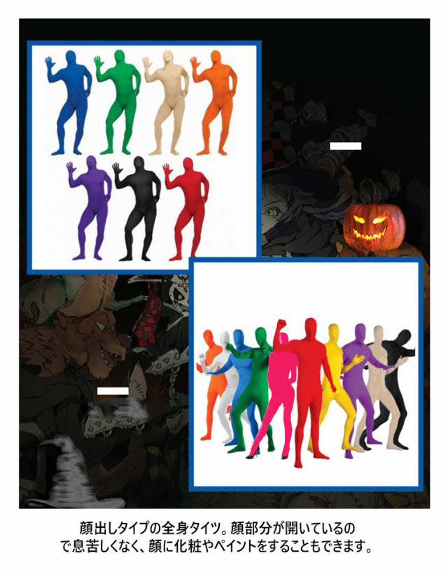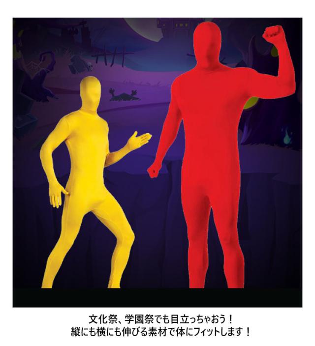 | のびーーーる素材の全身タイツです! コスプレのお供はもちろん、忘年会,新年会,節分でも大活躍! 飲み会、宴会、結婚式の余興の最強盛り上げアイテム! 文化祭、学園祭でも目立っちゃおう! 縦にも横にも伸びる素材で体にフィットします! 顔まですっぽり覆うタイプの全身タイツ。薄くて軽い、伸縮性のある素材を使用しているため熱がこもりにくく、快適な着心地。 顔出しタイプの全身タイツ。顔部分が開いているので息苦しくなく、顔に化粧やペイントをすることもできます。 タイツの後ろにファスナーが着いているので脱ぎ着もラクラクです。 男女兼用ですので、女性の方も着用可能です! ウィッグや小物と合わせてアレンジ無限大! 1人で着ても、みんなで一緒に着ても目立つこと間違いなし! | |