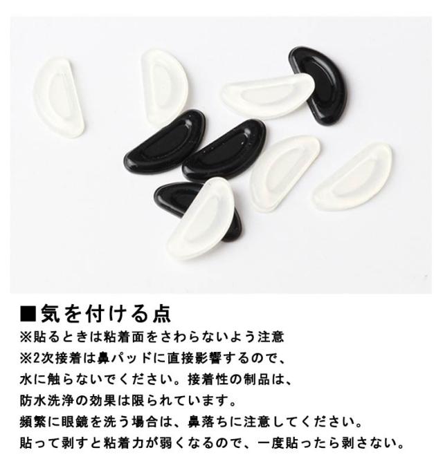 | メガネのずり落ち防止や眼鏡の跡がつかない為のシリコン鼻パッド!! カラーもクリアとブラックの2色!!サングラス、黒縁メガネ、おしゃれメガネにも使えるメガネの鼻パッド♪ D型の立体形状で最適な位置をキープ。滑り止め加工が皮脂でメガネを滑るのを防ぎ、フィット感を更に高めます。 ピッタリ密着するやわらかシリコンで一般のメガネパットよりも、メガネ跡がつかない仕様に。 長時間つけると、痛いメガネ跡のお悩みもサポートしてくれるメガネ跡防止パットです。 【メガネずり落ちないパットの使い方】 ■貼り方の流れ 1:まず洗剤で眼鏡を洗い、表面の油汚れが制品を傷つけ、効果に影響を与えないようにする。 2:滑り止めメガネをメガネの鼻あての弧の一番端の位置に貼り付けるとよい 3:はがす時、粘着力が大きいため、力を入れてください。ただし、指は貼り付け位置に直接触れないでください。 4:貼った後、はがさないでください。位置がずれている場合は、適切な位置に直接移動して、さらに押してください。 ■気を付ける点 ※貼るときは粘着面をさわらないよう注意 ※2次接着は鼻パッドに直接影響するので、水に触らないでください。接着性の制品は、防水洗浄の効果は限られています。頻繁に眼鏡を洗う場合は、鼻落ちに注意してください。貼って剥すと粘着力が弱くなるので、一度貼ったら剥さない。 | |