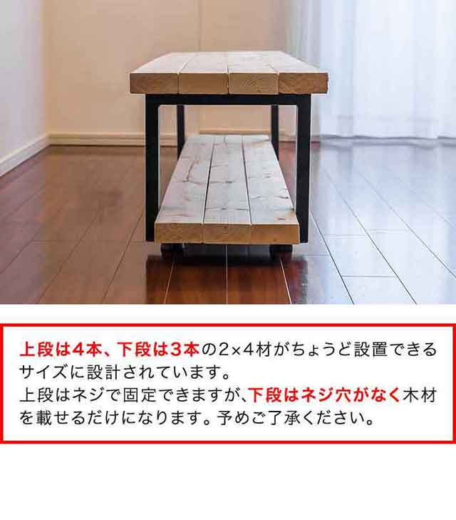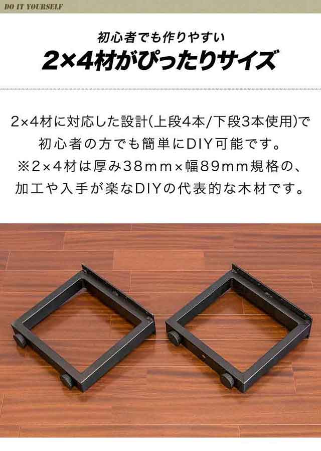 | 特記事項: ※天板・ネジは付属しません。 ※本製品とそこに載せる天板の厚みを考慮した長さのネジをご用意ください。 ※天板に下穴を開けてからネジを取り付けてください。 ※天板の素材や大きさ・厚み等によって耐荷重は異なります。 ※上段は4本、下段は3本の2×4材がちょうど設置できるサイズに設計されています。 ※下段はネジ穴がなく木材を載せるだけになります。 |