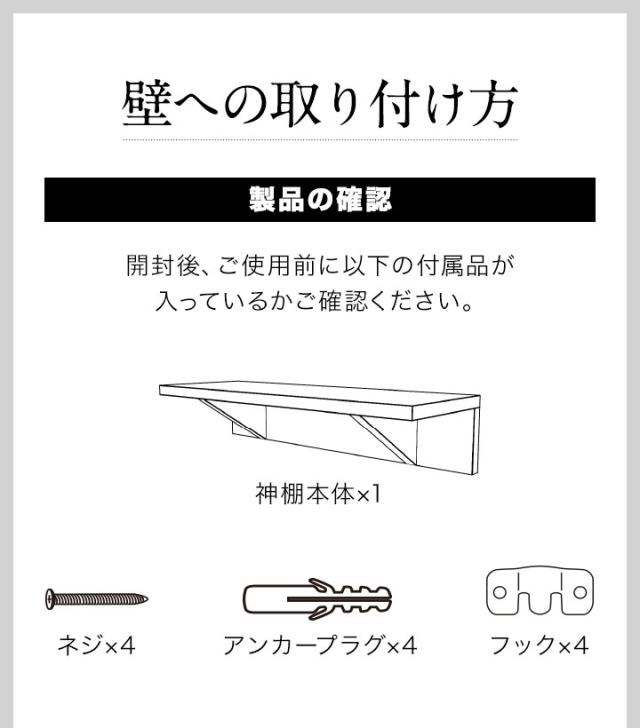 | 付属品: ・神棚本体×1 ・ネジ×4 ・アンカー×5 ・フック×2 |