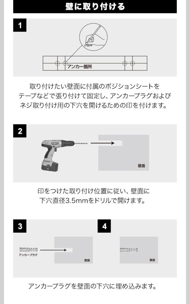 | 安全上の注意: ・本製品の分解・改造はしないでください。 ・温度変化が急激な場所には取付けないでください。 ・たわしやブラシ、シンナーなどの溶剤、漂白剤、酸性・アルカリ性・塩素系洗剤など商品を傷めるものは使用しないでください。 ・耐荷重を超える荷重はかけないでください。 ・しっかりセットしてから使用してください。使用中にガタついた場合はセットし直してご使用ください。 |