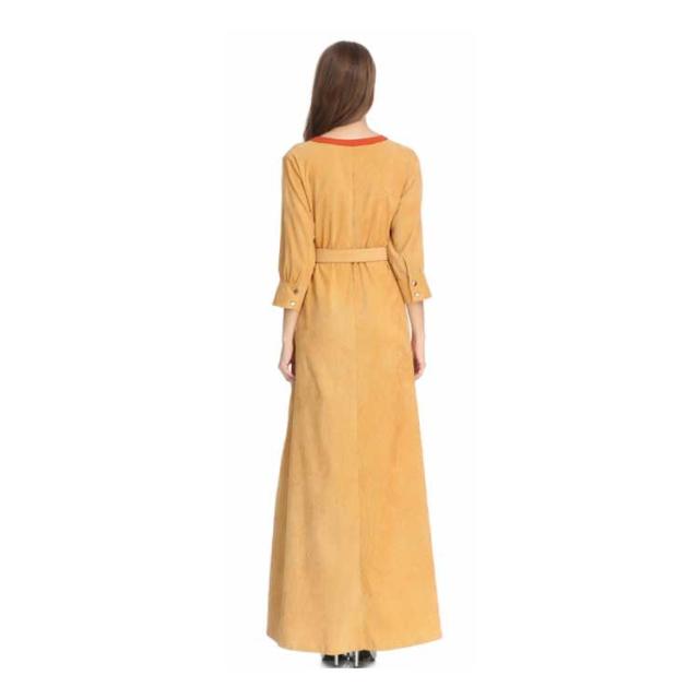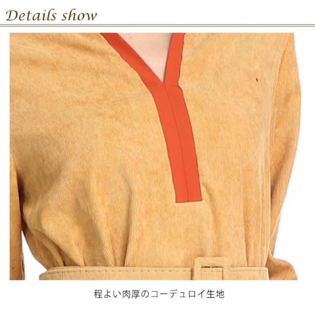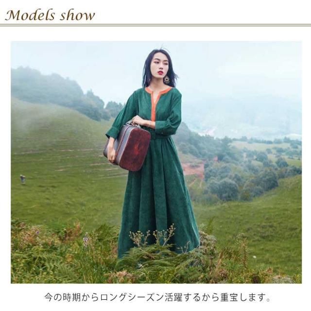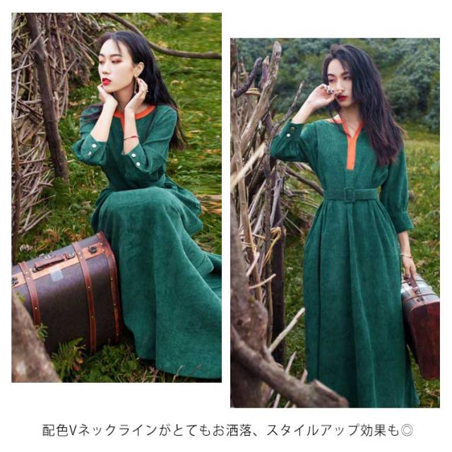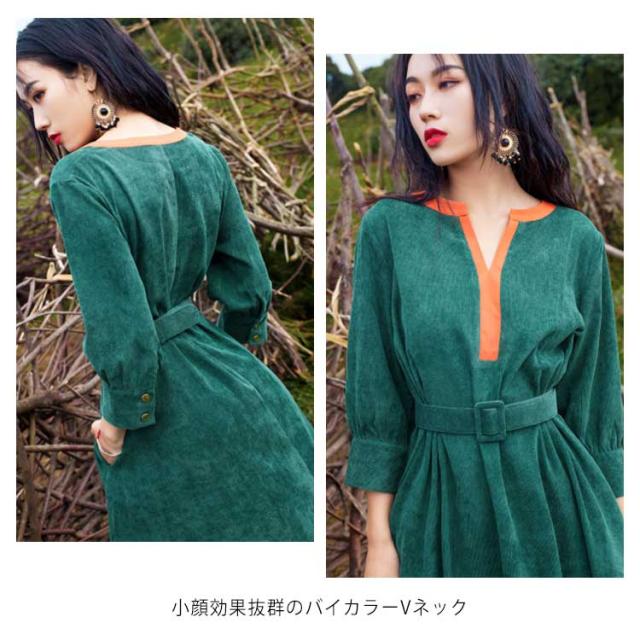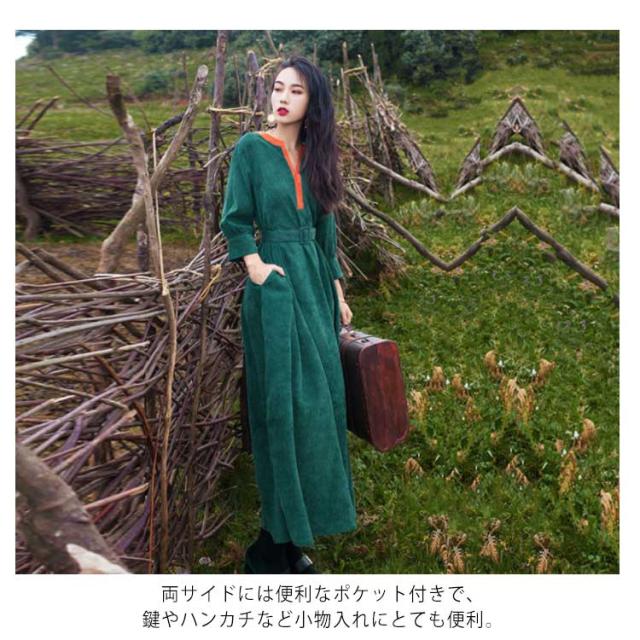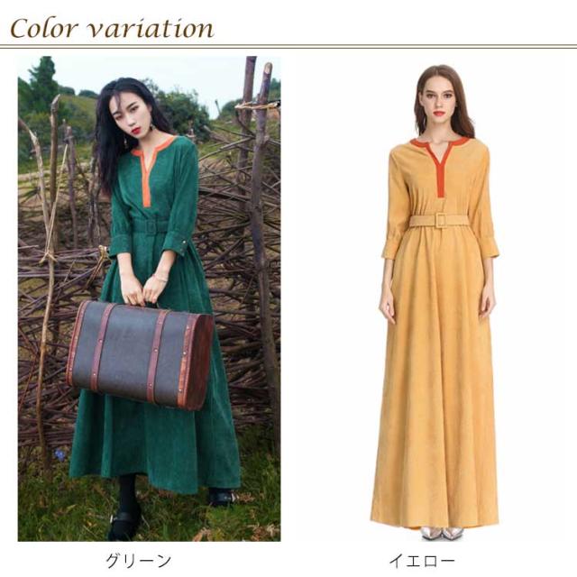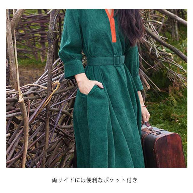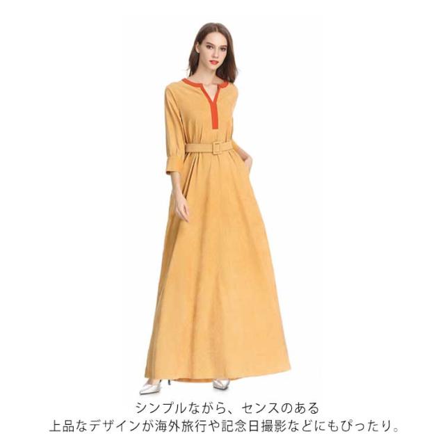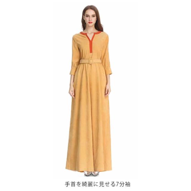 コーデュロイ ワンピース 7分袖 配色 ロングワンピース レディース ヴィンテージ ベルト付き ポケットあり マキシ丈 Vネック Aライン フレアワンピース キレイめ リゾート 秋冬 旅行