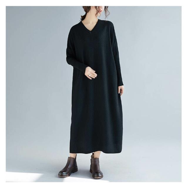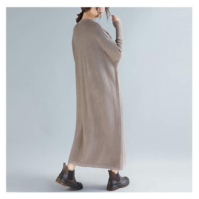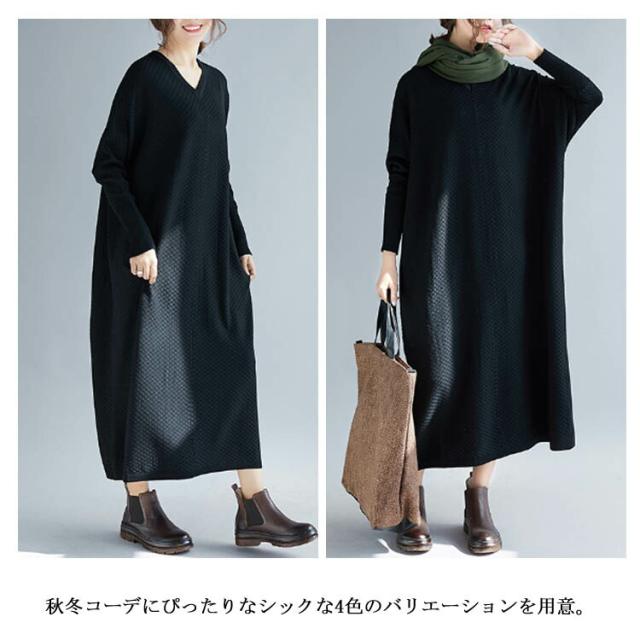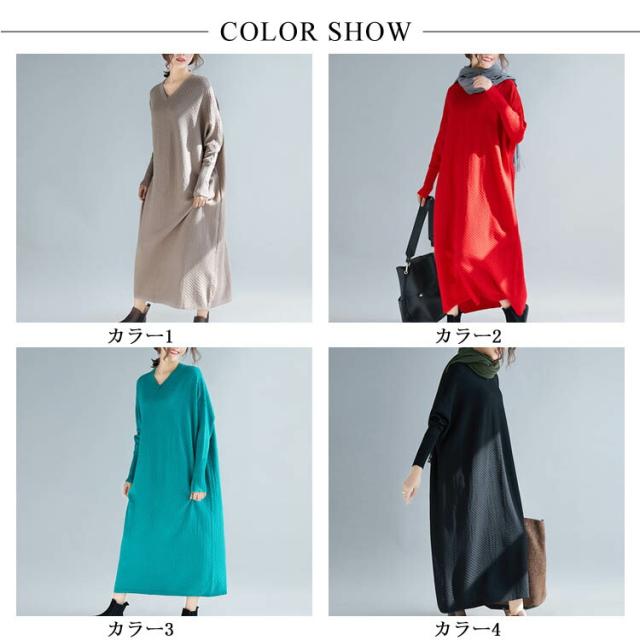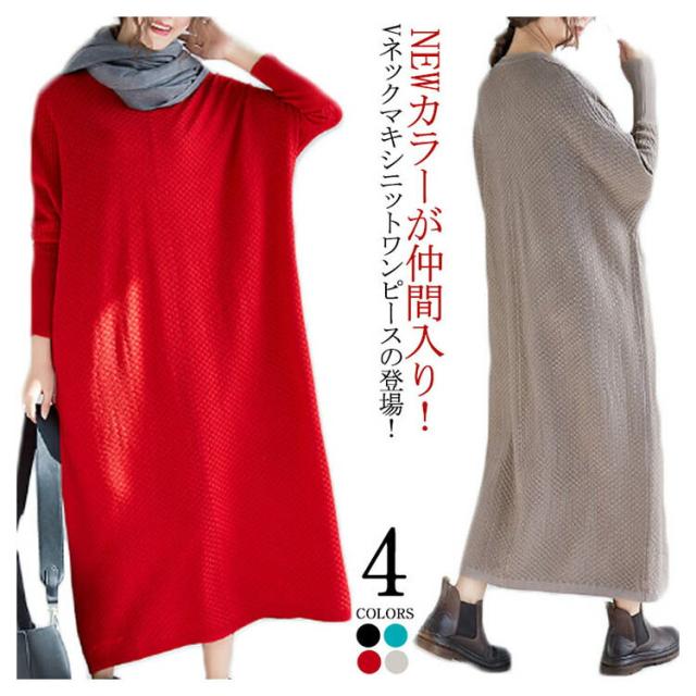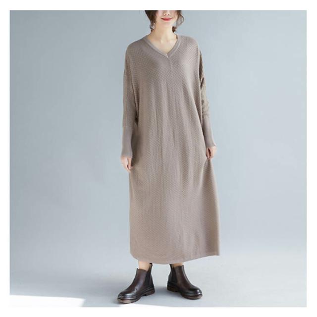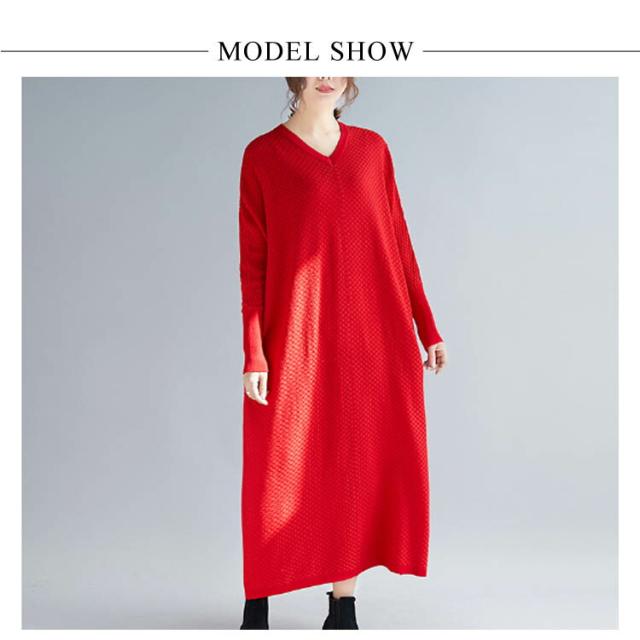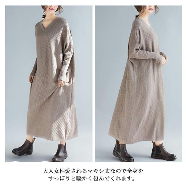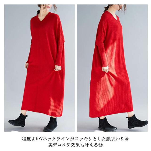 ルーズなシルエットがストレスゼロ!マキシ ニットワンピース Vネック マキシワンピース マキシニットワンピース 秋冬 ニットワンピ 長袖 ゆったり 体型カバー シンプル 無地 ドルマンスリーブ