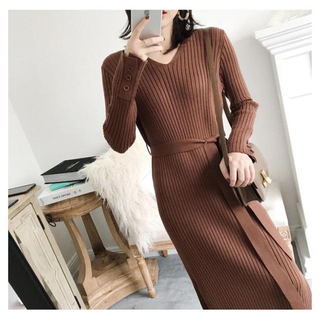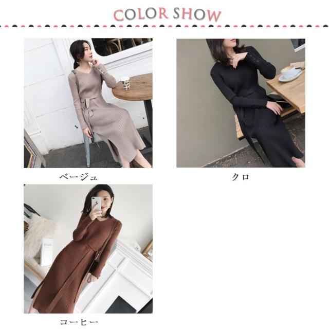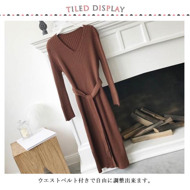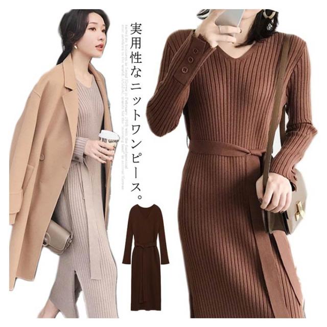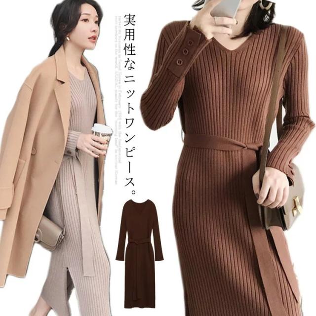 ニットワンピース ニットドレス ニットワンピ ニット ワンピース ドレス リブニット Vネック レディース シンプル ウエストベルト付き 体型カバー 長袖 ロング丈 お呼ばれ 着痩せ 秋冬 無地 大人 結婚式 オフィス 全3色