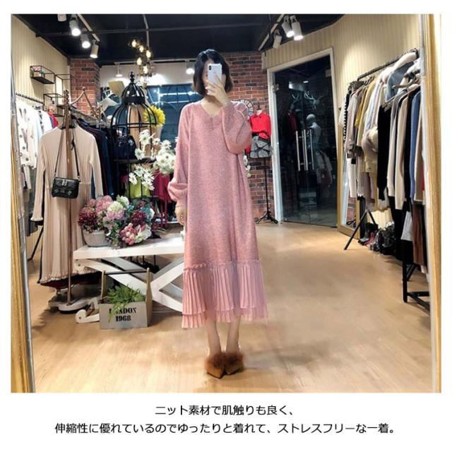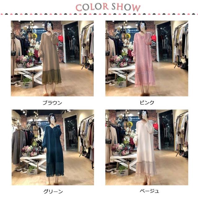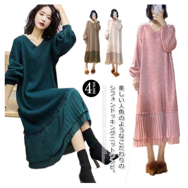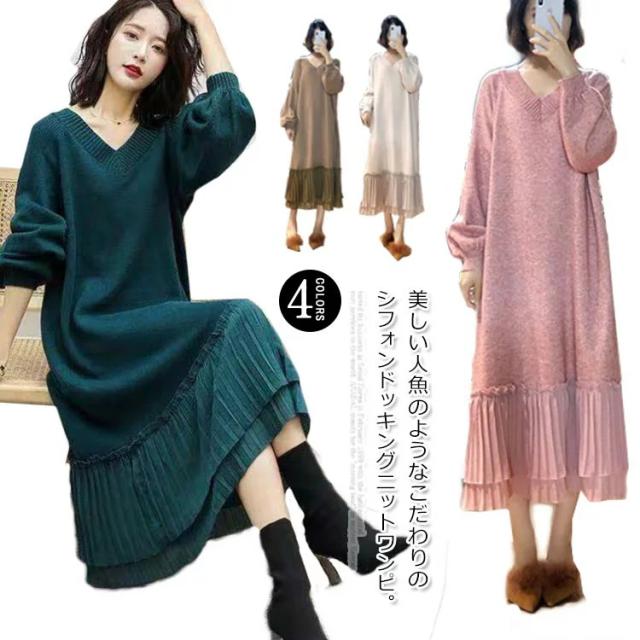 全4色!ニット ワンピース ニットワンピース ニットワンピ ドッキングワンピース レディース シフォン 切り替え ドッキング フェミニン きれいめ 通勤 オフィス ミモレ丈 Vネック ゆったり 秋 冬 おしゃれ