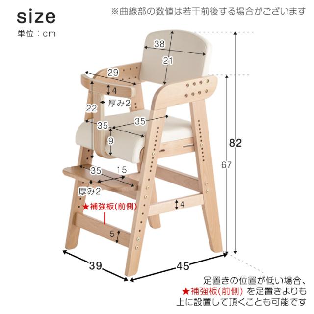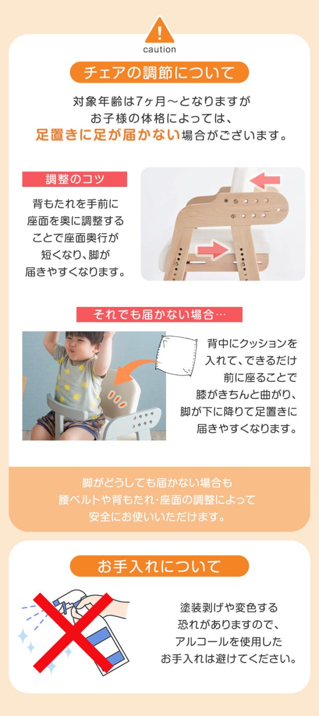 また特にお子様の体が小さい時期には、足置き・背もたれにお子様の脚や背中が届かない場合がございます。お子様が小さいうちは、背もたれを前に出し、座面を高く・短く調整するようにお願い致します。
