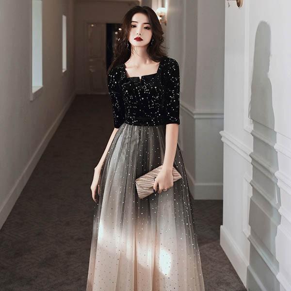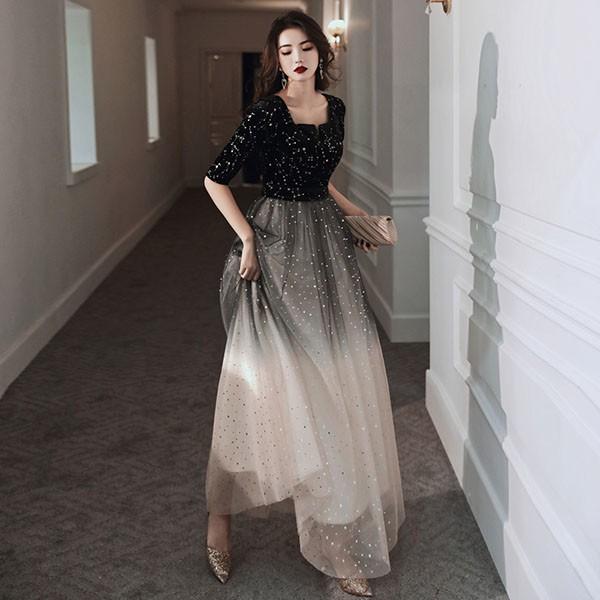 【レビュー投稿で+5%還元】ドレス 大人 ピアノ発表会 ドレス 演奏会 結婚式 フェミニン パーティードレス ロングドレス 袖あり お呼ばれ 可愛い フェミニン 黒