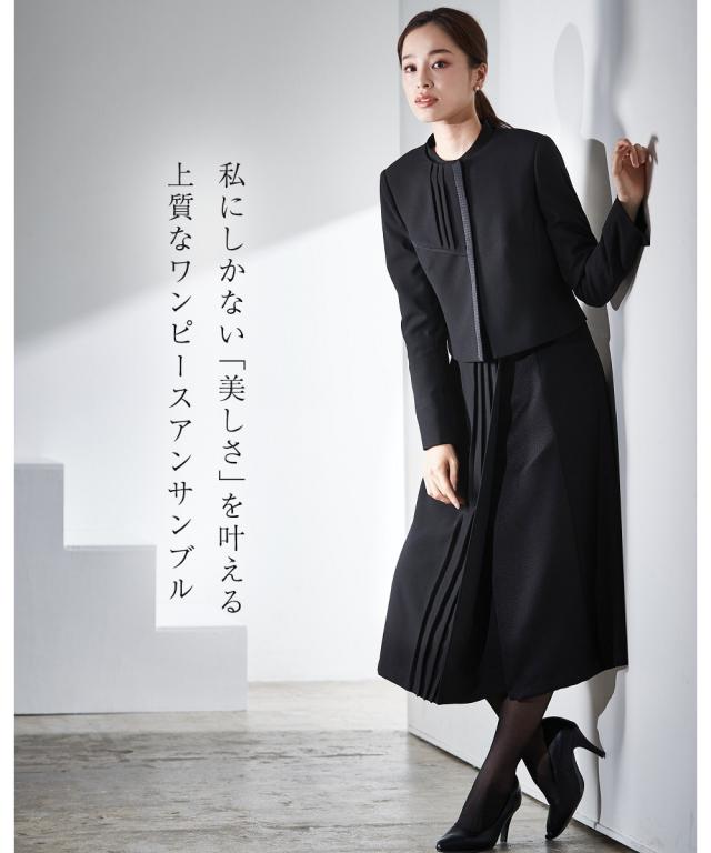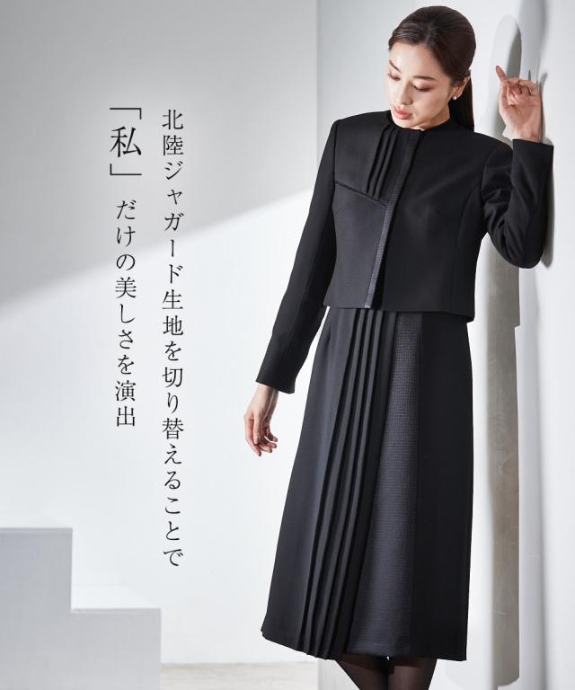 【Callarus(カラルス)】 〜for Black Formal〜まっすぐブレない美しさで人々を魅了する花“calla lily”とラテン語で輝くという意味の“clarus”を合わせた造語がブランド名の由来です。<自分らしく上品で美しい装いを大切にする方へ>縛られたカタチではなく、「想い」が人と人をつなぐシーンにもテイストにも年齢にも縛られない自由な着こなしを実現する新しいブラックフォーマル。 こだわりポイント北陸ジャガードを切り替えたプリーツデザインワンピースアンサンブル北陸ジャガードとプリーツを合