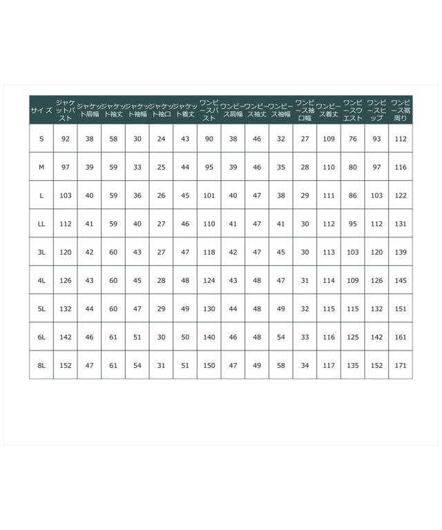 品質=[表地]ポリエステル100%)(バックサテンジョーゼット)[別布]ポリエステル100%(北陸ジャガード)[裏地]ポリエステル100%【裏地】有(ジャケット総裏、ワンピース身頃部のみ)ジャケット:肩パッド無 前スナップ開き 袖口スリットワンピース:前ファスナー開 右脇シームポケット※この商品は2点同サイズのみで販売します。※ジャケットはLLサイズから五面体仕様です。 原産国:中国製(企画デザインは日本) 洗濯表示:ドライ