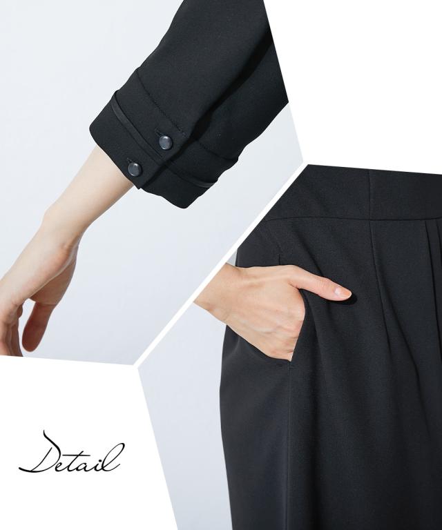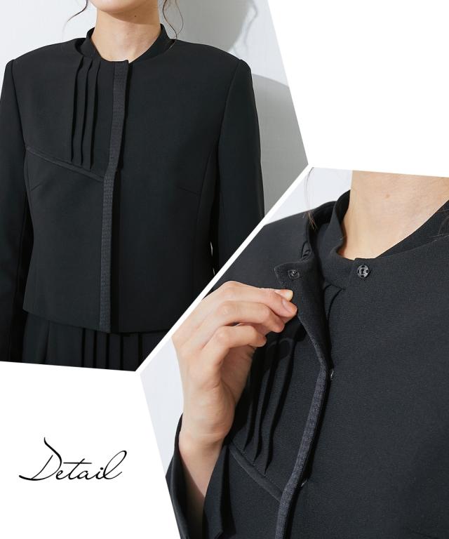 【Callarus(カラルス)】 〜for Black Formal〜まっすぐブレない美しさで人々を魅了する花“calla lily”とラテン語で輝くという意味の“clarus”を合わせた造語がブランド名の由来です。<自分らしく上品で美しい装いを大切にする方へ>縛られたカタチではなく、「想い」が人と人をつなぐシーンにもテイストにも年齢にも縛られない自由な着こなしを実現する新しいブラックフォーマル。 こだわりポイント北陸ジャガードを切り替えたプリーツデザインワンピースアンサンブル北陸ジャガードとプリーツを合