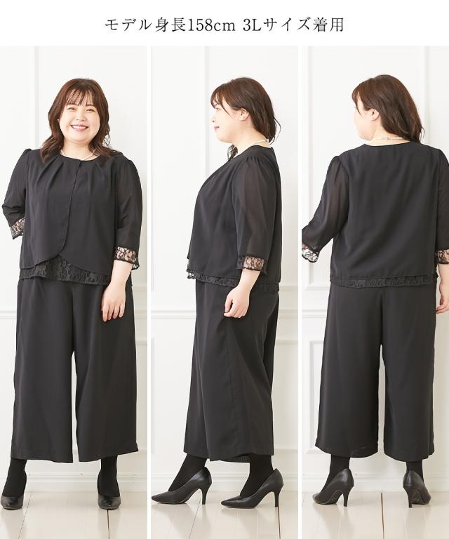 喪服 礼服 スーツ パンツ レディース Callarus 洗える防しわ レース 使い 前開き ブラウス +ワイド セットアップ 黒 LL/3L ニッセン nissen