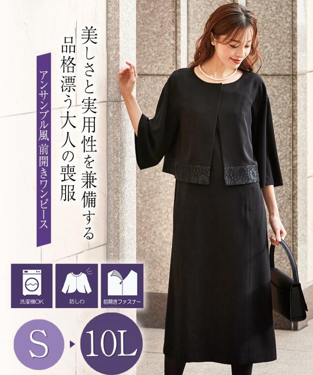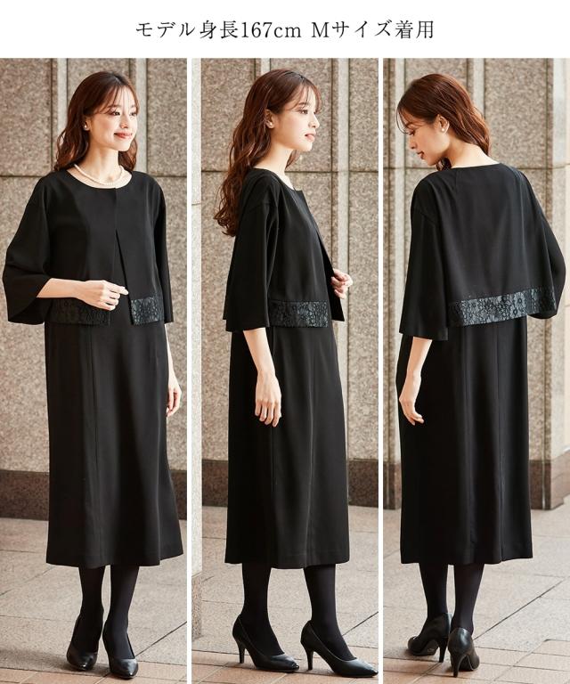 喪服 礼服 ワンピース レディース 洗える防しわ 前開き 裾 レース アンサンブル風 黒 M/L ニッセン nissen